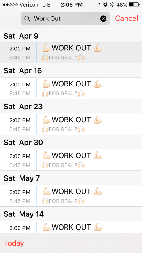 13. Put workouts on your social calendar. "The best time of day to work out is the time of day that you're actually going to workout," Rosante says. So if you know you get E-X-H-A-U-S-T-E-D after school or work, that's probably not your hour to shine. Once you figure out when you can sweat like you mean it, put at least two or three sessions a week into your phone calendar to make things *~oFfIcIaL*~.